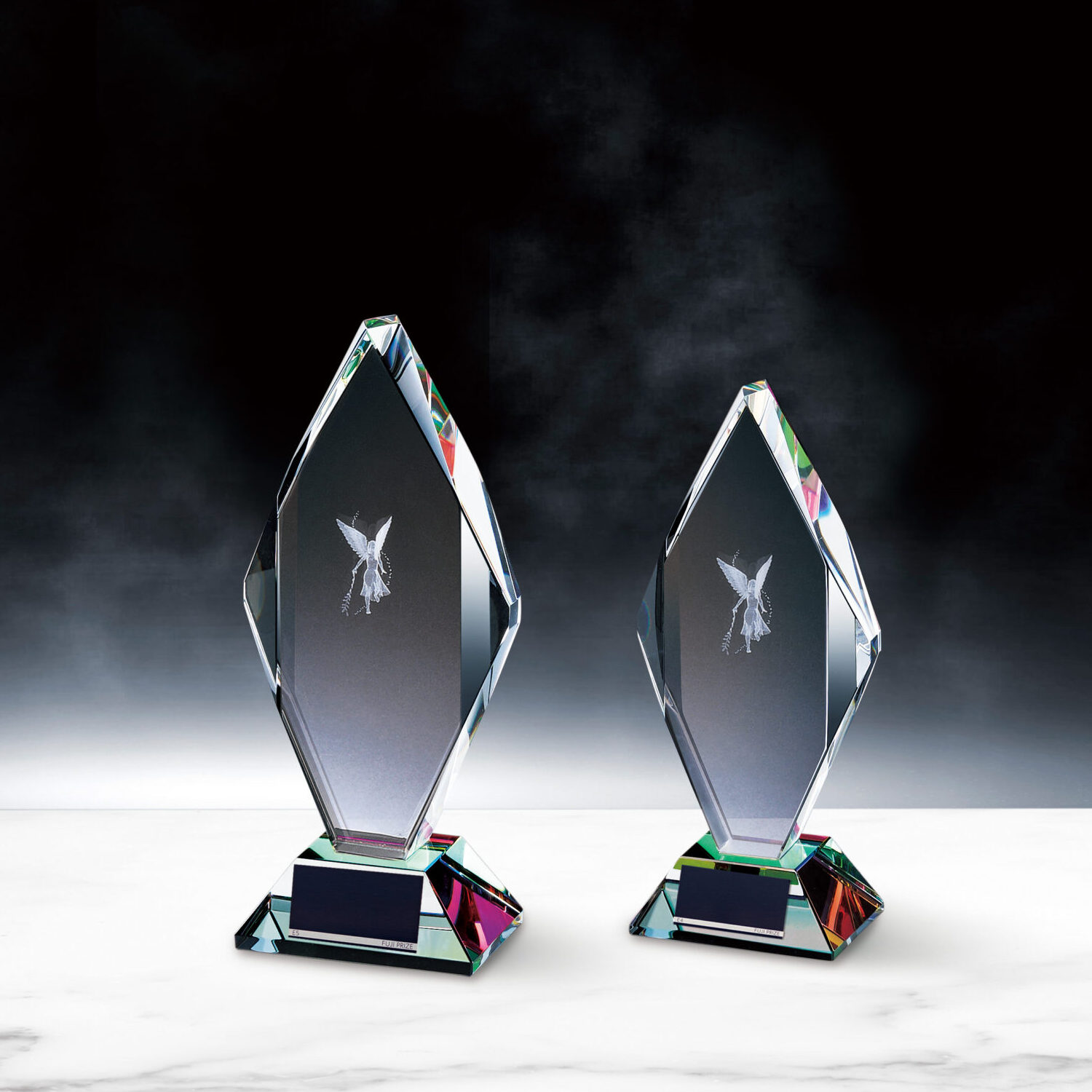 光学ガラス製のクリスタルトロフィーです。レインボーメッキは角度によって様々な色に輝きます。クリスタルの中に3Dレーザー彫刻が彫られています。