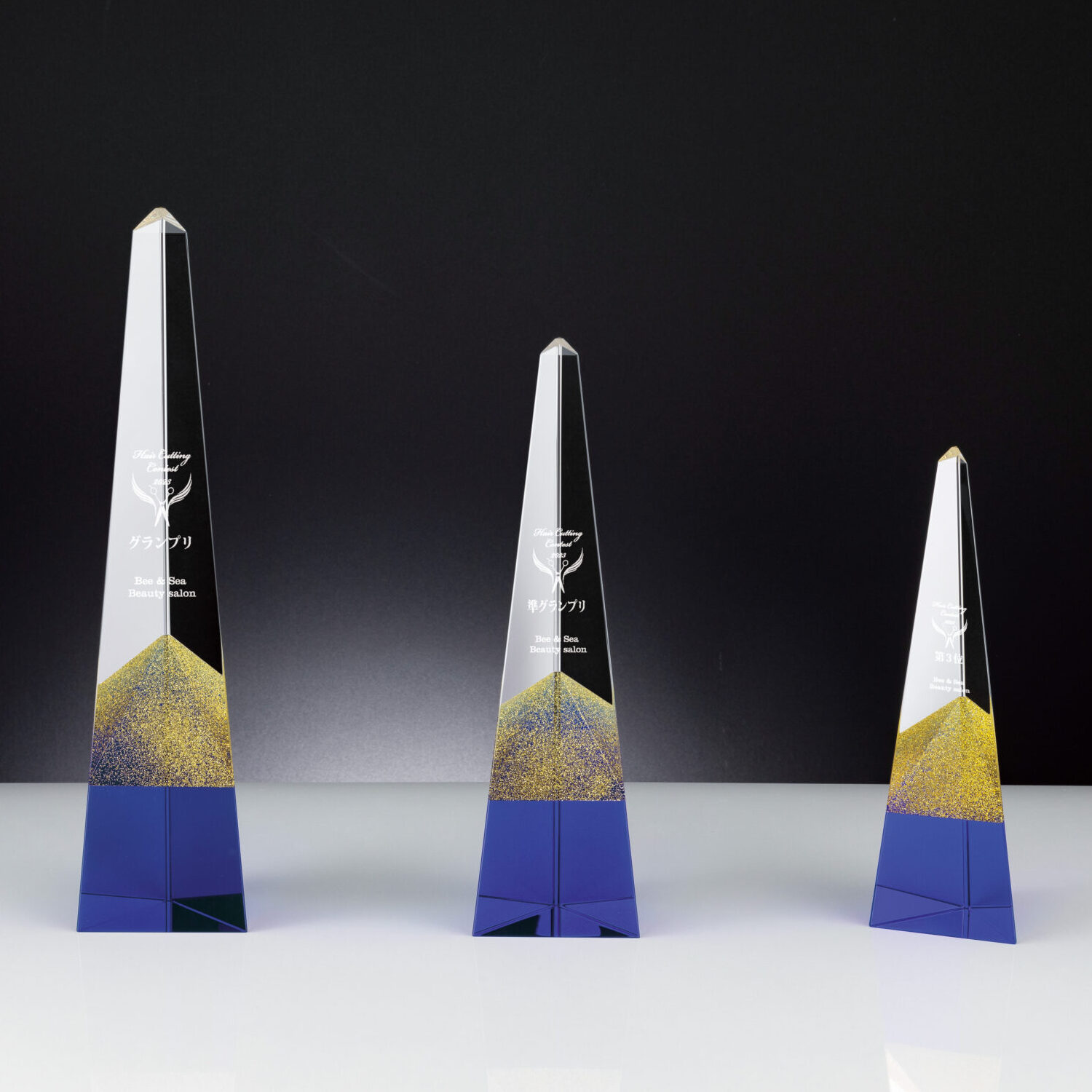 ゴールドのラメが輝く華やかなオベリスク型のトロフィーです。
