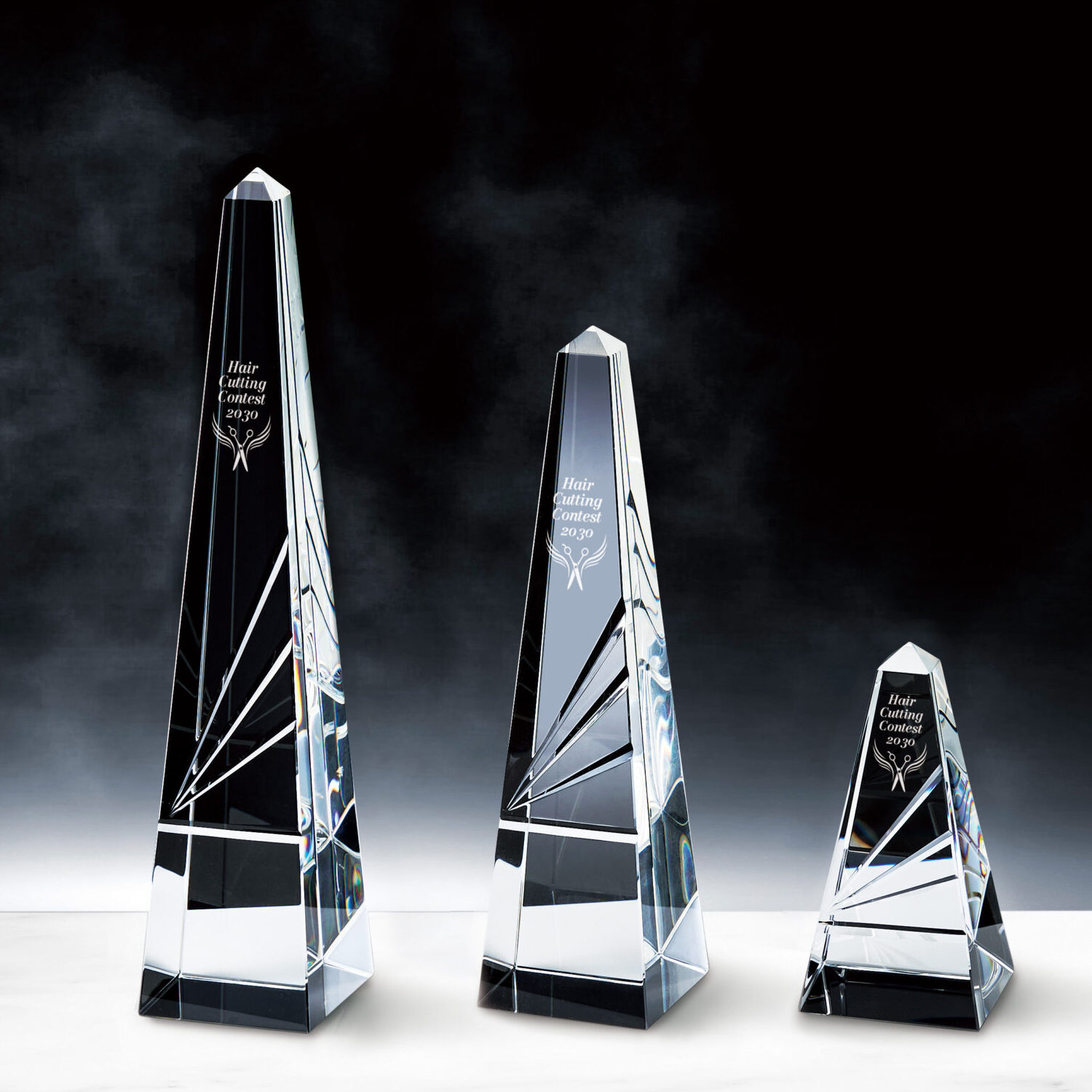 本体表面に切り込みのアクセントが入ったオベリスク型のトロフィーです。