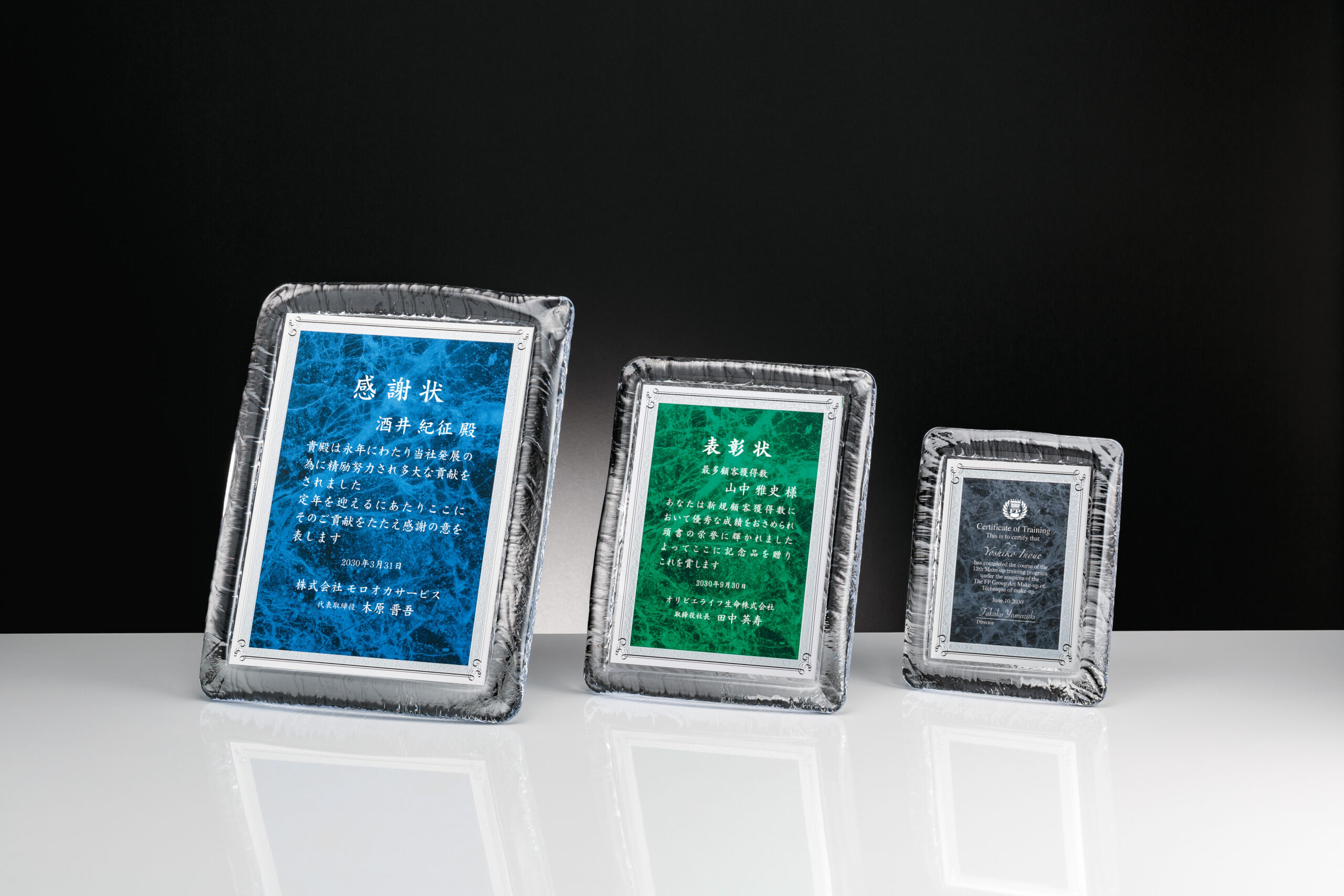 マーブル模様がエレガントなアルミプレートがついたガラス製の楯です。