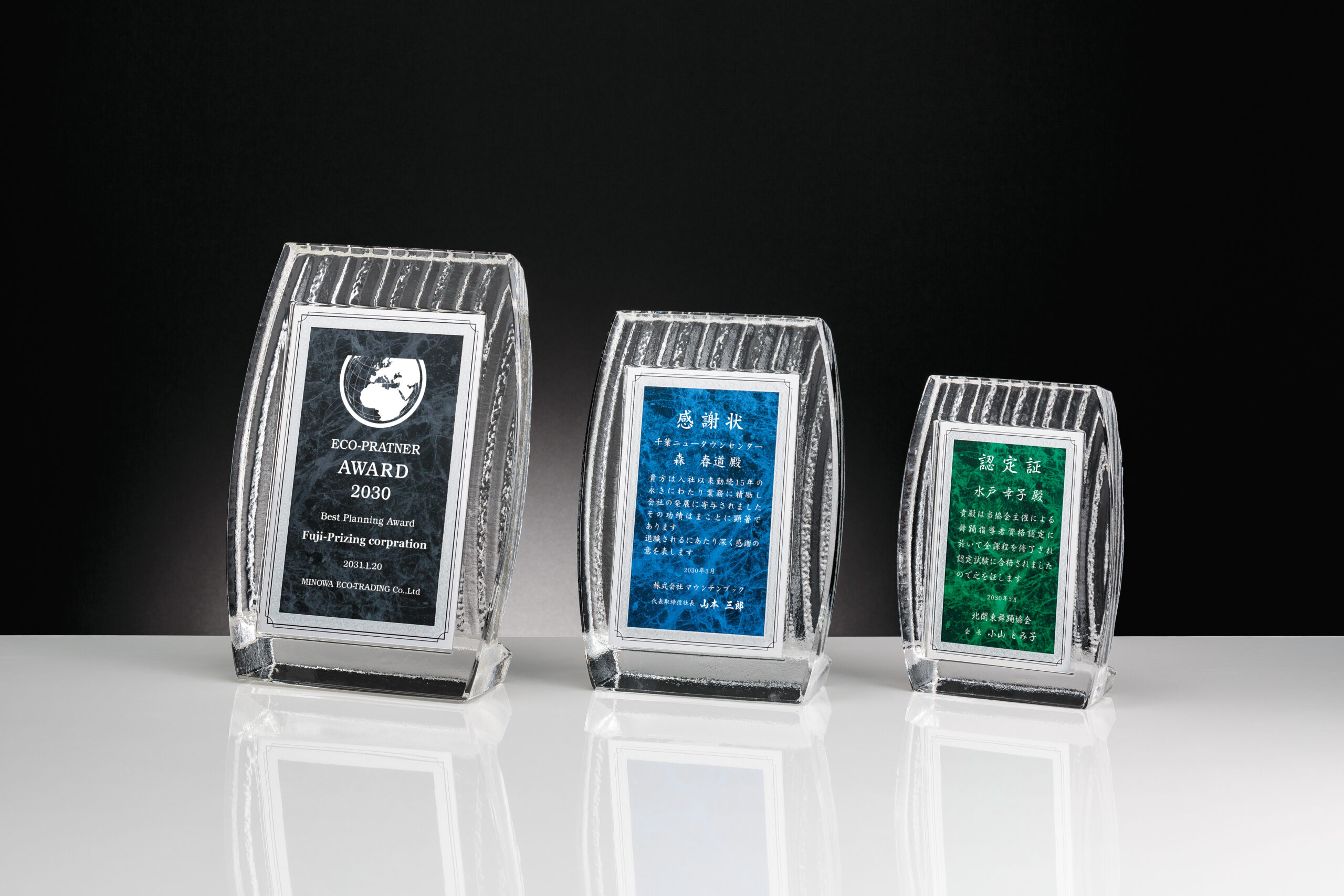 マーブル模様がエレガントなアルミプレートがついたガラス製の楯です。